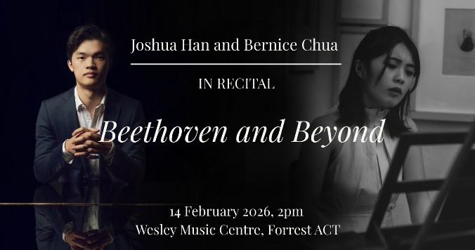 Australian pianists Joshua Han and Bernice Chua join forces in Canberra's Wesley Music Centre for a recital of two Beethoven sonatas and beyond. 23-year-old Australian pianist Joshua Han has been praised for “complete mastery of his instrument as well as complete empathy with the music” (Sydney Arts Guide). Joshua is…
