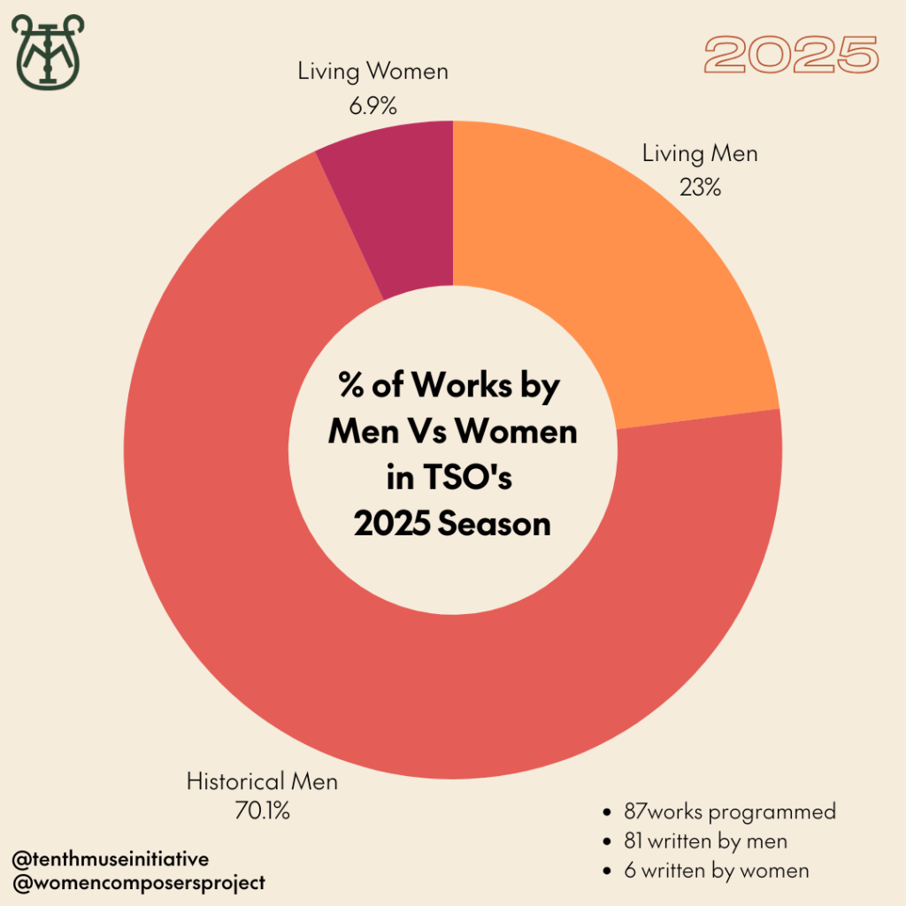 TSO’s 2025 program represented living composers at almost 30 percent; at QSO, this was 13.1 percent , with historical men comprising 85.7 percent of its program.