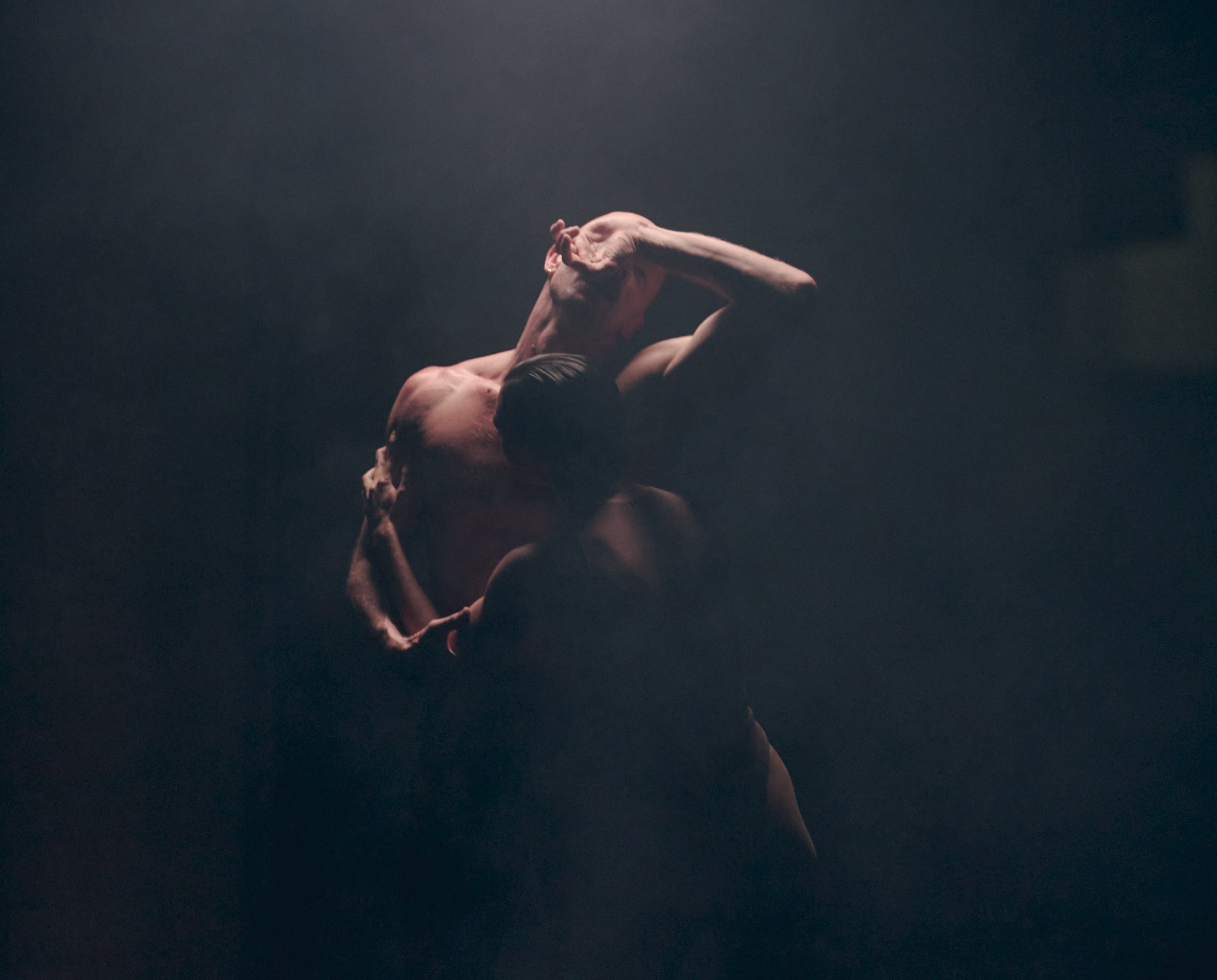All the while, two semi-clad dancers – Benjamin Behrends and Chloe Leong – stand in a constant embrace as plumes of smoke repeatedly engulf them. Jesus Christus schwebt am Kreuzel (Jesus Christ hangs on the Cross) from Schubert’s Stabat Mater is heard over the loudspeakers, and its emotional intensity quickly compels the audience to fall silent.